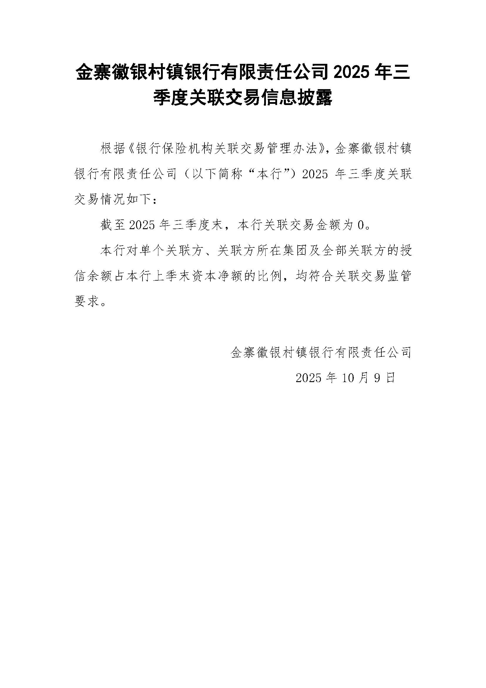 金寨徽银村镇银行有限责任公司2025年三季度关联交易信息披露